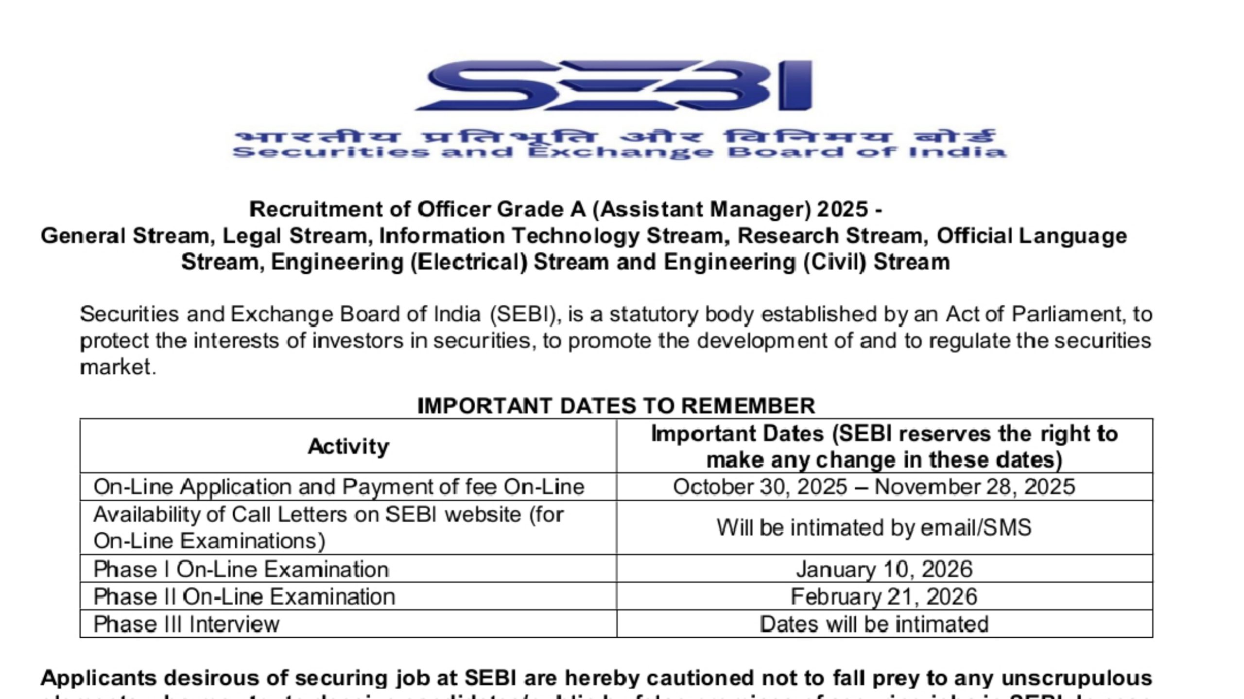 • SEBI Recruitment for 110 Assistant Manager Posts; Apply by November 28