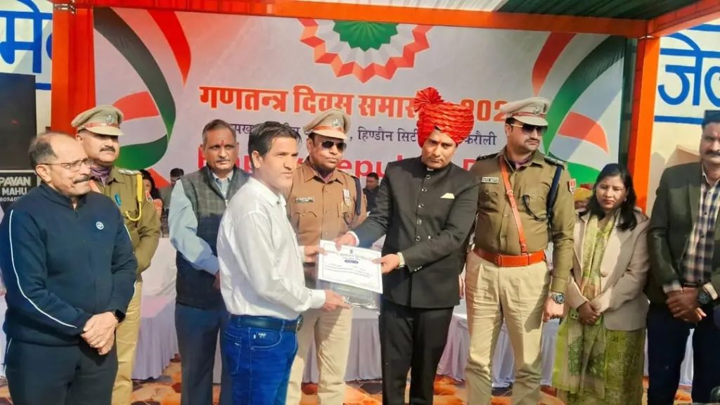 Hindaun City, Karauli. On the auspicious occasion of Republic Day, our colleague Kalmuddin Khan was honored for his outstanding work in the field of journalism at a special ceremony held in Hindaun. He was felicitated by the Sub-Divisional Magistrate (SDM) and Additional Superintendent of Police (ASP) of Hindaun.