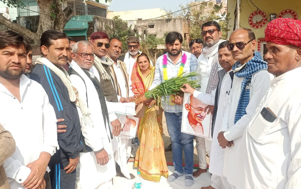 During the protest, Congress workers from Surauth welcomed and honored Ravi Gurjar, the Congress in-charge for the Hindaun Assembly constituency, by presenting him with a sapling of wheat.