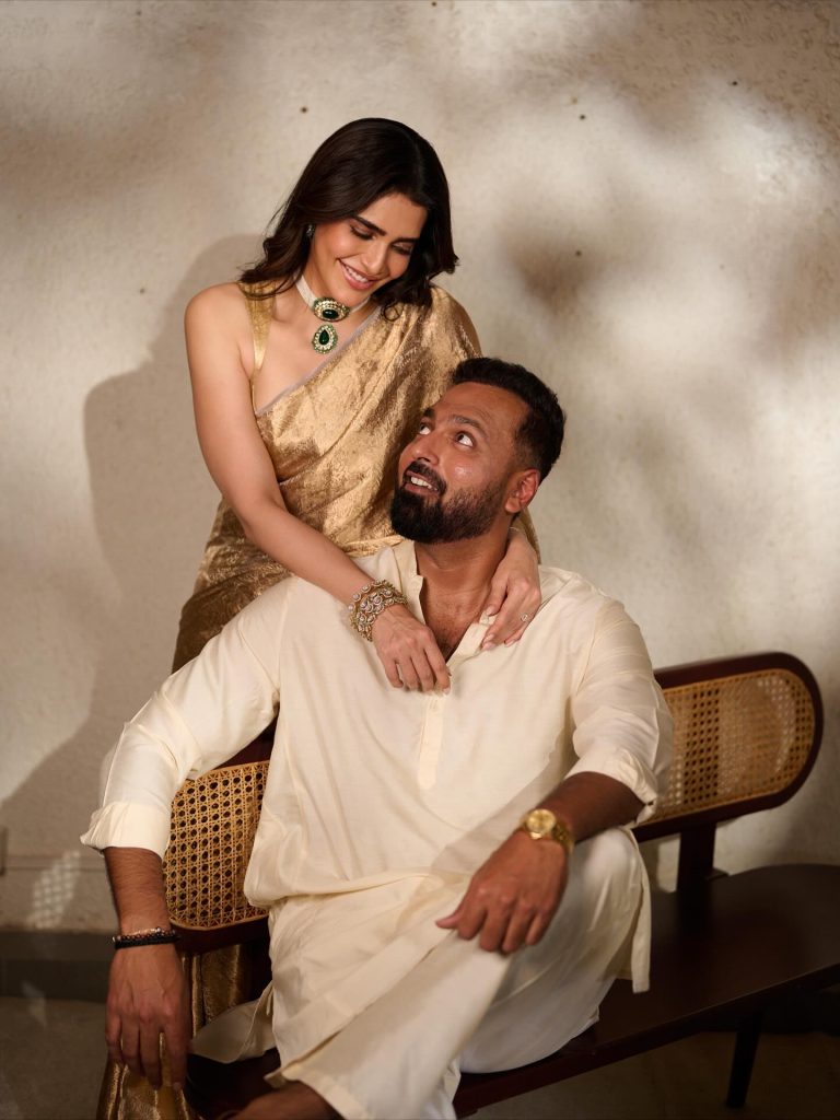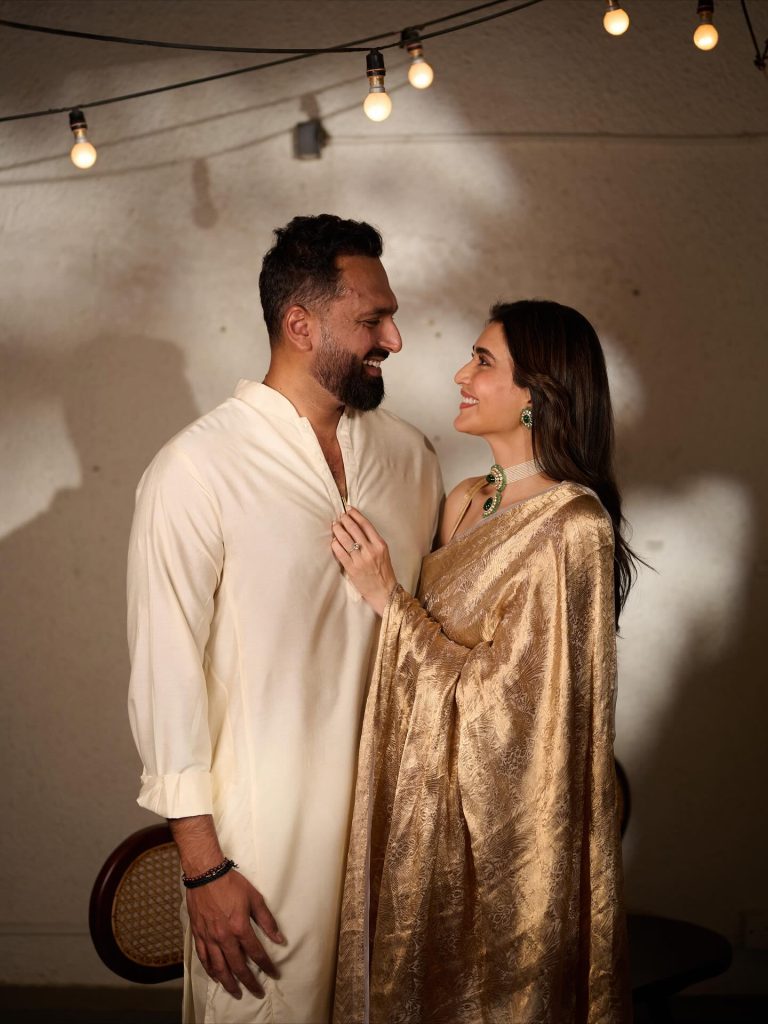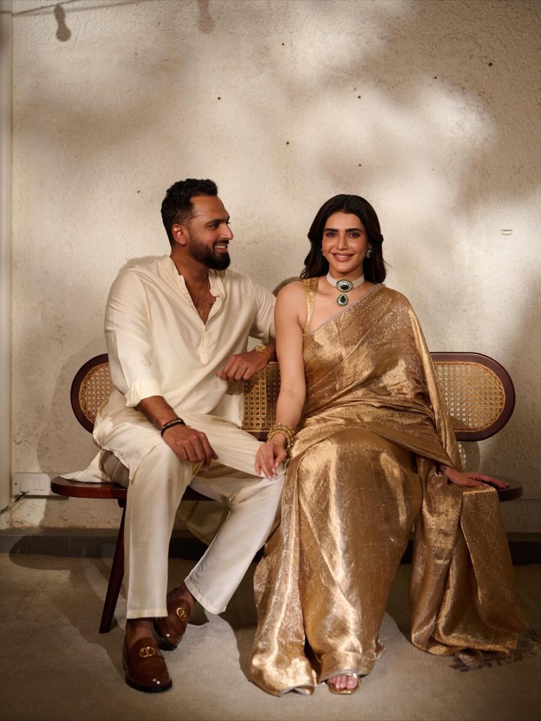 Celebrity News : Karishma Tanna and Varun Bangera’s latest look is sure to leave everyone stunned. Their dazzling presence has left an impression that feels brighter and more vibrant than sparklers! Their photos and videos are going viral on social media, and fans are praising their style.