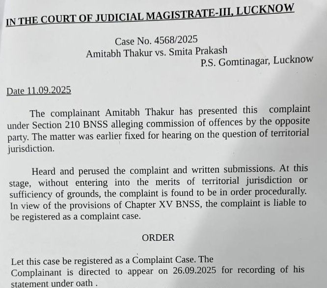 Conducting a preliminary hearing in the case, the court stated that the complaint was found to be procedurally correct. It ordered that it be filed as a duly filed complaint and directed Thakur to appear on September 26, 2025, to record her sworn statement.