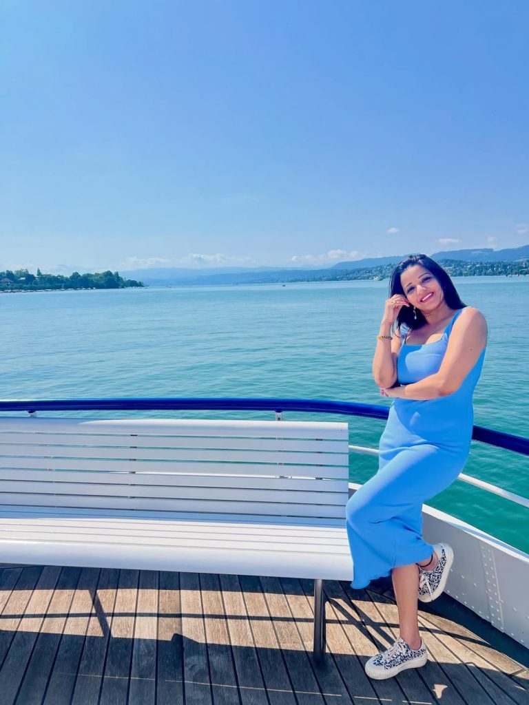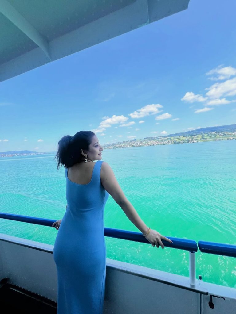 In these photos, Monalisa is seen standing on a boat amidst the calm, blue-green waters of the ocean or lake.