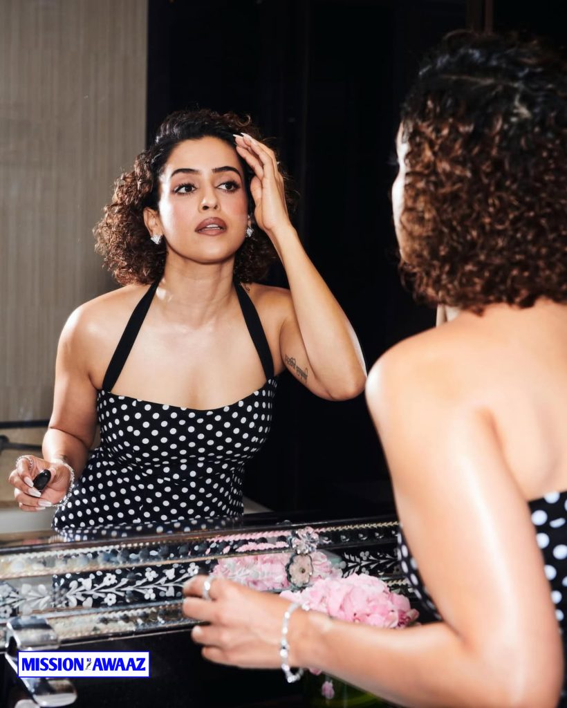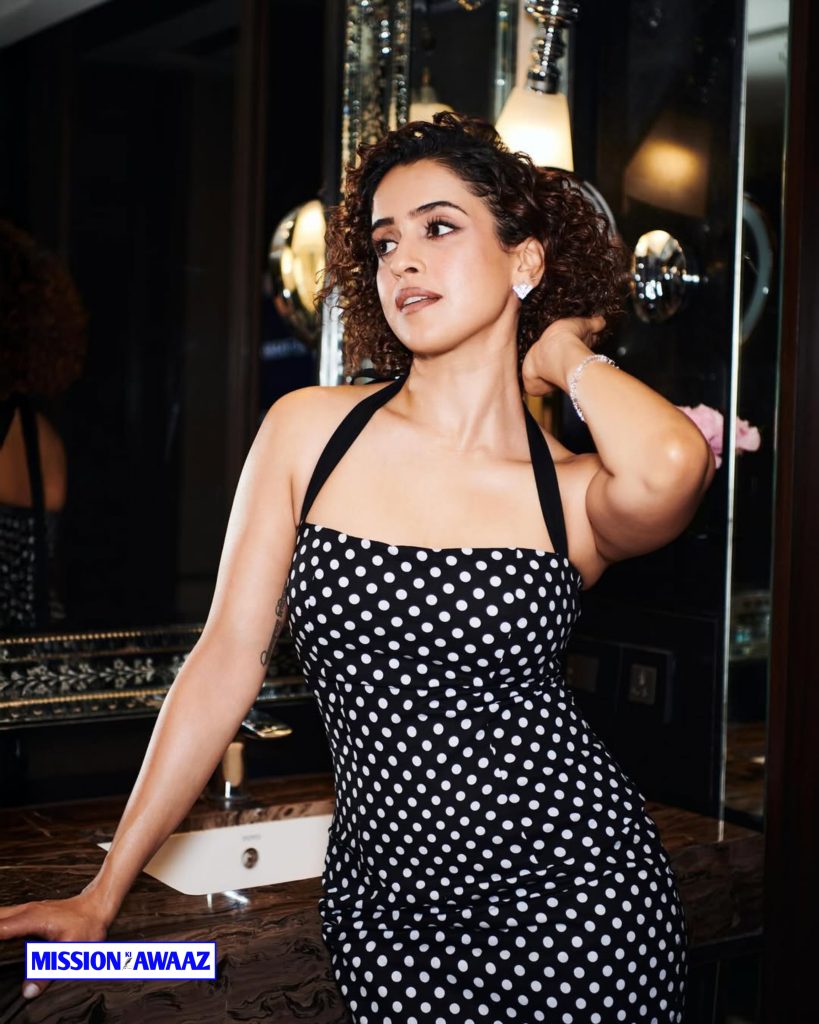 Sanya Malhotra : Bollywood actress Sanya Malhotra turned heads this week in a striking polka dot outfit that effortlessly blended retro charm with modern elegance. The actress, known for her versatile roles and impeccable fashion sense, stepped out in a chic halter-neck dress that highlighted her toned shoulders and exuded timeless glamour.