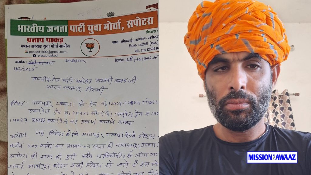 Narayanpur/Sapotra: BJP leader Pratap Pakad has written a letter to Railway Minister Ashwani Vaishnav, demanding the stoppage of three major trains at Narayanpur Tatwara railway station. In the letter, he stated that train number 12903/12904 Golden Temple Express, train number 20451 Saugaria Express, and train number 19037/19038 Avadh Express should stop at Narayanpur Tatwara station.