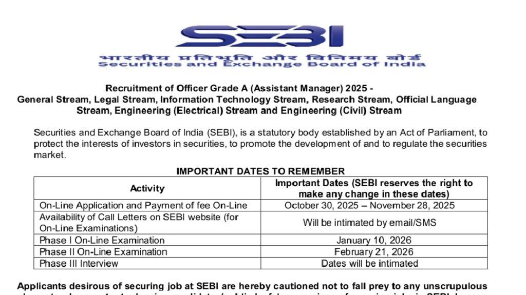 There’s good news for young people preparing for government jobs. The Securities and Exchange Board of India (SEBI) has released a notification for the recruitment of Officer Grade-A (Assistant Manager) positions. Interested candidates can apply online until November 28, 2025. Applications will be accepted only through SEBI’s official website.
