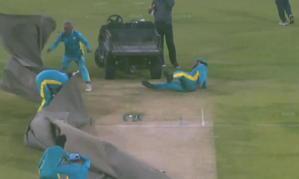 The incident sparked a mix of amusement and concern among fans online, with many highlighting how unexpected weather conditions can affect even routine tasks during major sporting events. Some viewers praised the groundstaff for quickly regaining composure and returning to their duties despite the brief disruption.