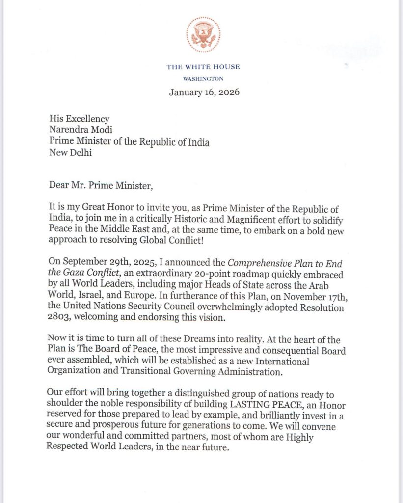 Trump’s Letter to PM Modi: Donald Trump has written a letter to Prime Minister Narendra Modi. In the letter, President Trump said that it is a great honor for him to invite Prime Minister Modi, as the Prime Minister of the Republic of India, to participate in a crucial, historic, and momentous effort to strengthen peace in the Middle East, and to adopt a bold new approach to resolving global conflicts.