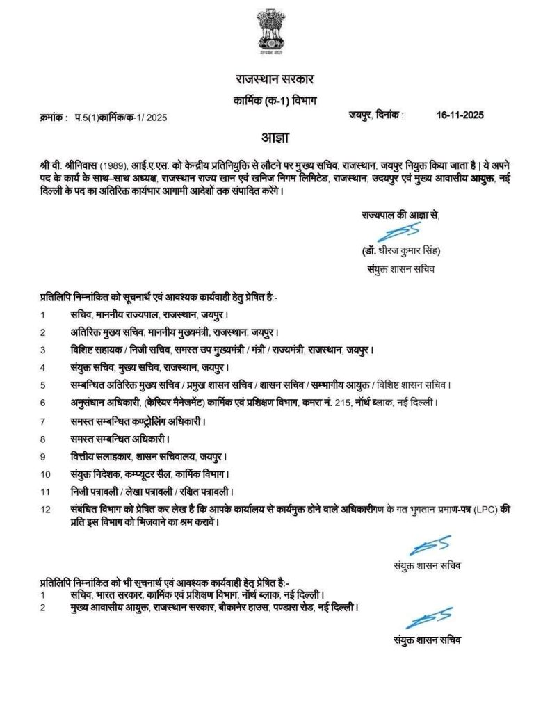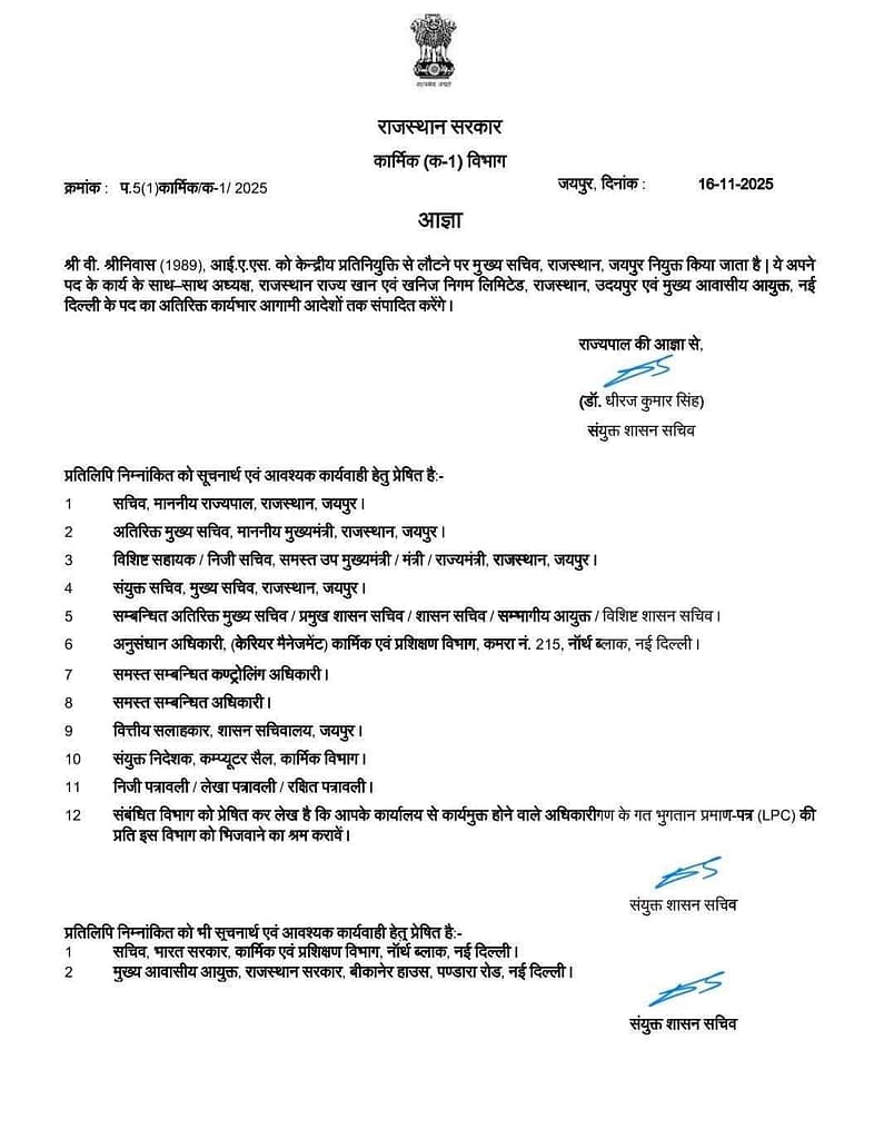 V. Srinivas new Chief Secretary of Rajasthan :The state government has appointed senior 1989 batch IAS officer V. Srinivas as the new Chief Secretary of Rajasthan. The Personnel Department issued his appointment order on Sunday. Srinivas will assume charge on Monday (November 17), following the release of the current Chief Secretary Sudhansh Pant.